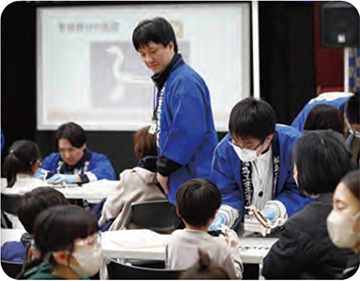 「“ワザ伝”プロジェクト」では地域との連携、地元のモノづくりを子どもたちに知ってもらうことも目指しています。今回は福島工業高等専門学校の教員・学生が教える水陸両用恐竜模型づくり、福島市内の看板製作・有限会社タカ工芸社は太毛筆と指文字での作品づくりを実施し、匠の技を披露しました。子どもたちは、指文字によるはがきづくりを体験しました。