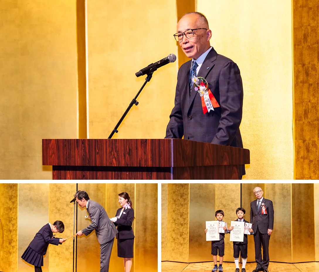 表彰式には、受賞者をはじめそのご家族約80名と作品の審査を行った選考委員が参加。セレモニーに先立ち当法人理事長の山岡徹朗より、「2万1877作品の中から選ばれた作文を読み、皆さんの見る力、思う力の素晴らしさをひしひしと感じました。今日の体験を通じて感じたこともぜひ文字に残してほしい。そして作文の輪を広げてほしいです」と祝辞が述べられました。