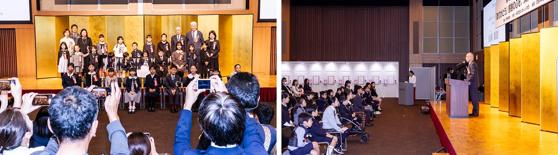 受賞者が一人ずつ壇上に上がると、プレゼンターから表彰状と副賞が手渡されました。照れながらも、その顔には誇らしい笑顔が輝いていました。会場では、わが子の晴れ姿を写真に収めようとするご家族や、家族の受賞に惜しみない拍手を送るごきょうだいの姿などが、あちらこちらで見られました。温かい祝福に満ちた、和やかな光景でした。