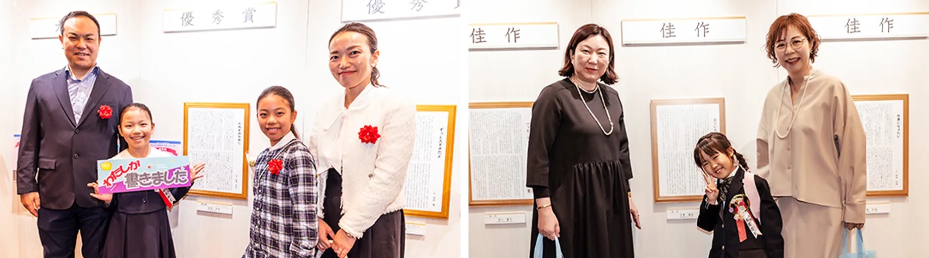 式典の前後には、受賞者とそのご家族が記念写真を撮影する様子があちらこちらで見られました。パネルに飾られた自分の作品を読み返したり、他の受賞者の作品を熱心に読んだりする様子も見られました。また、受賞作品パネルの前で、選考委員の三浦氏や椰月氏と記念撮影する姿も。会場全体が終始たくさんの笑顔であふれていました。