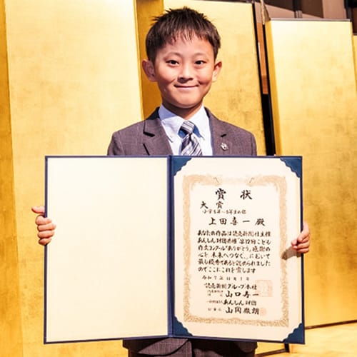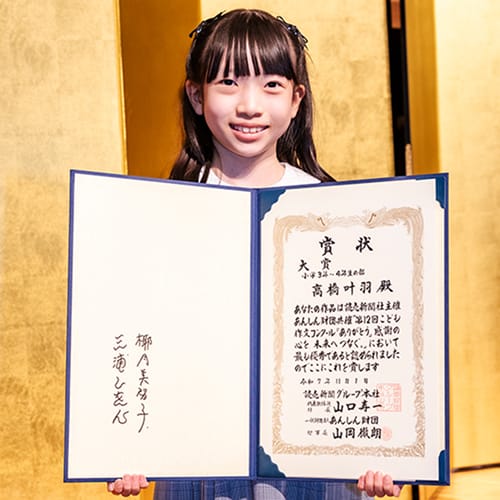 小学1年~2年生の部、小学3年~4年生の部、小学5年~6年生の部の3部門に分け、厳正な審査の下、大賞・優秀賞・読売新聞社賞・あんしん財団賞・選考委員特別賞・佳作の全25作品を選出。受賞作品には、家族や身近な人との何気ない日常の中で生まれた感謝や発見、喜び、そして未来への夢などが、子どもたちの言葉で丁寧につづられており、読むと情景が目に浮かぶようでした。子どもたちならではの豊かな感性とみずみずしい表現が作品全体に息づき、希望に満ちた未来への思いが力強く描かれていました。